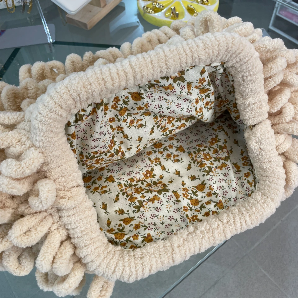Πρόκειται για ένα απαλό και χνουδωτό νήμα το οποίο πλέκεται με τα δάχτυλα, σε μπέζ απόχρωση, με εσωτερική φλοράλ φόδρα.