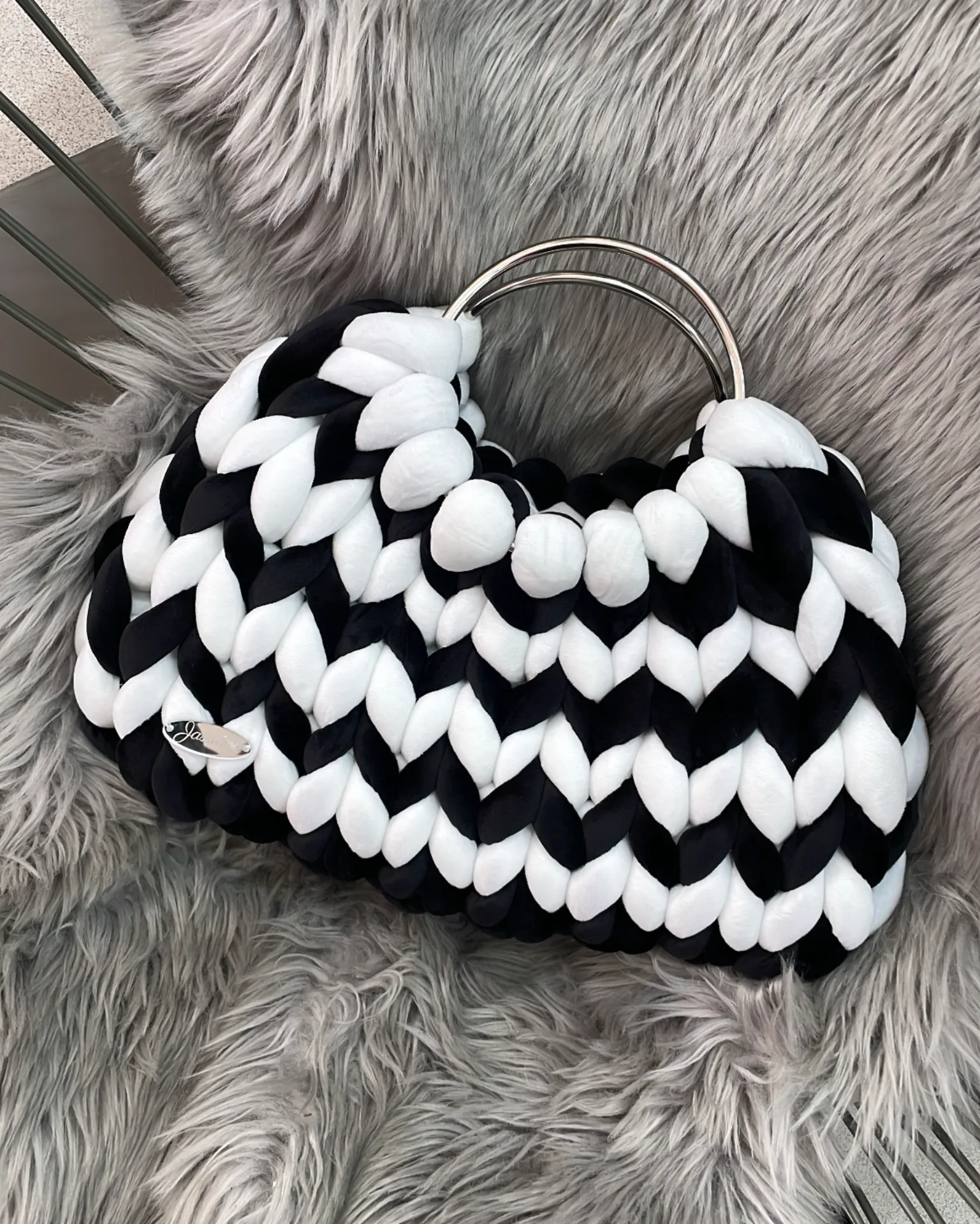 Μια statement χειροποίητη τσάντα που συνδυάζει το διαχρονικό ασπρόμαυρο με μοντέρνα αισθητική. Πλεγμένη στο χέρι από βελούδινο νήμα, με εντυπωσιακή υφή και μεταλλικά χερούλια που προσθέτουν κομψότητα.
