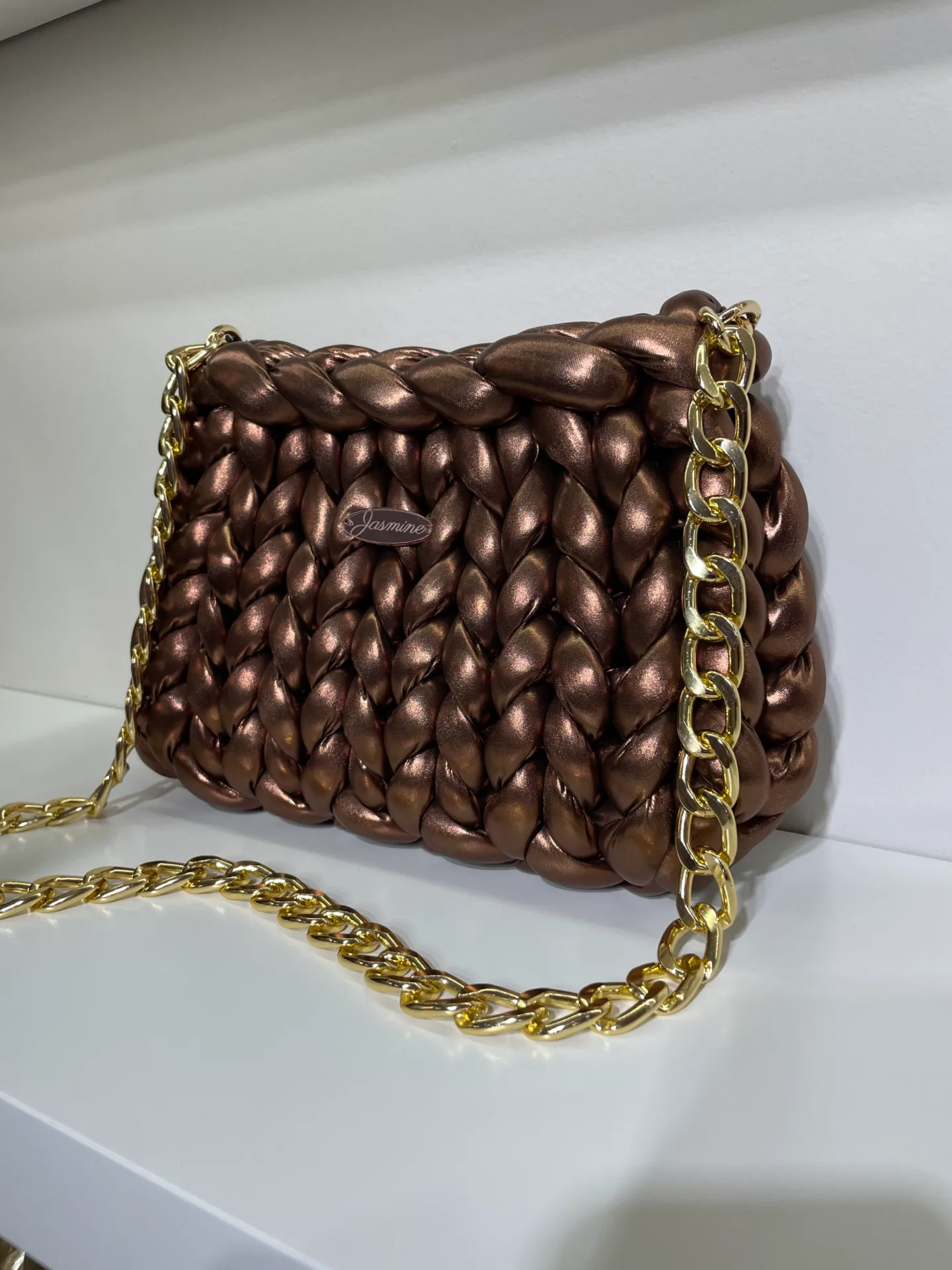 Χειροποίητη με προσοχή στη λεπτομέρεια, από μαλακό νήμα marshmallow που θυμίζει την υφή του δέρματος, προσφέρει μια κομψή και ταυτόχρονα μοντέρνα αισθητική. Το σχήμα φακέλου και η χρυςή αλυσίδα ώμου προσθέτουν ένα διαχρονικά σικ ύφος, ιδανικό για all-day εμφανίσεις ή ιδιαίτερες περιστάσεις.