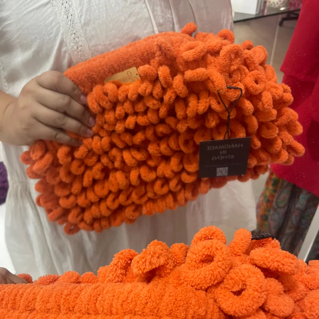 Πρόκειται για ένα απαλό και χνουδωτό νήμα το οποίο πλέκεται με τα δάχτυλα, σε πορτοκαλί απόχρωση, με εσωτερική φόδρα.