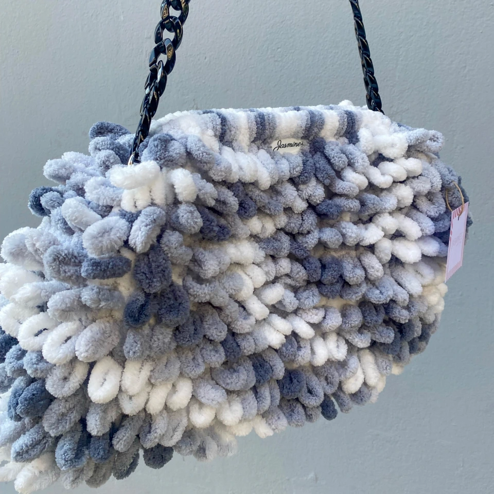 Πρόκειται για ένα απαλό και χνουδωτό νήμα το οποίο πλέκεται με τα δάχτυλα, τρίχρωμη (γκρί σκούρο, γκρί ανοιχτό και λευκό χρώμα) , διαθέτει μαύρη κοκκάλινη αλυσίδα ώμου.