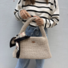 Απαλή, κομψή και μοναδική. Αυτή η βελουδινή χειροποίητη τσάντα χειρός ξεχωρίζει για την πλούσια υφή της και το έντονο μωβ χρώμα της. Τα μαύρα ξύλινα χερούλια προσφέρουν άνεση, ενώ το ιδιαίτερο πλέξιμο την κάνει πραγματικό fashion piece.