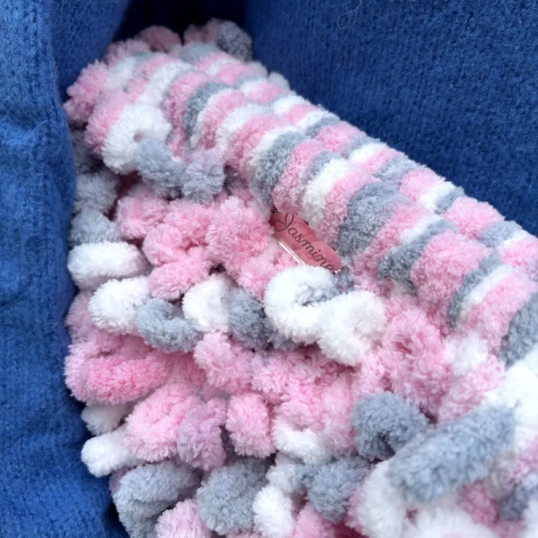 Χειροποίητη με extra fluffy νήμα σε τρεις αποχρώσεις – ροζ, λευκό και γκρι – δημιουργεί ένα μοναδικό, τρισδιάστατο αποτέλεσμα που θυμίζει marshmallow υφή.