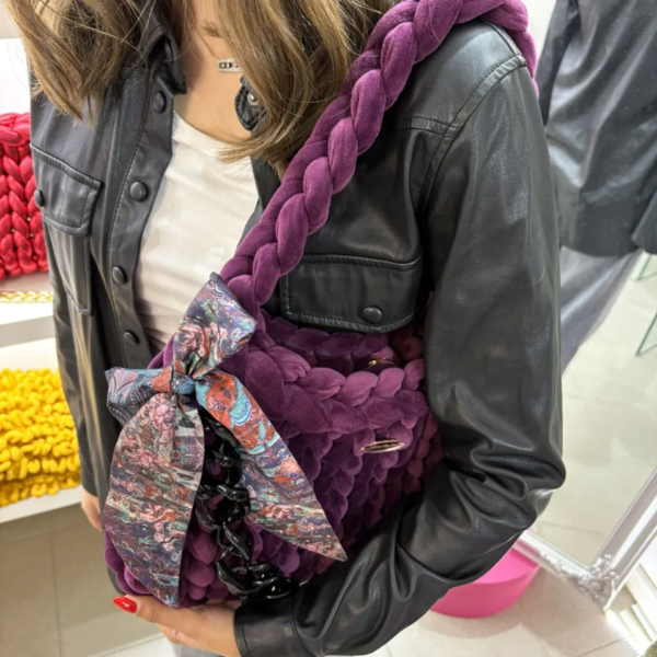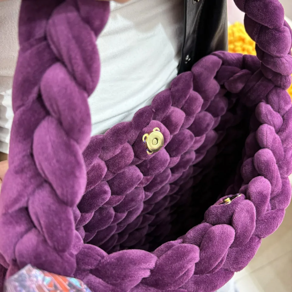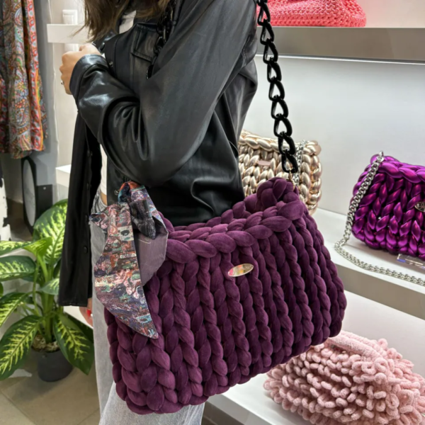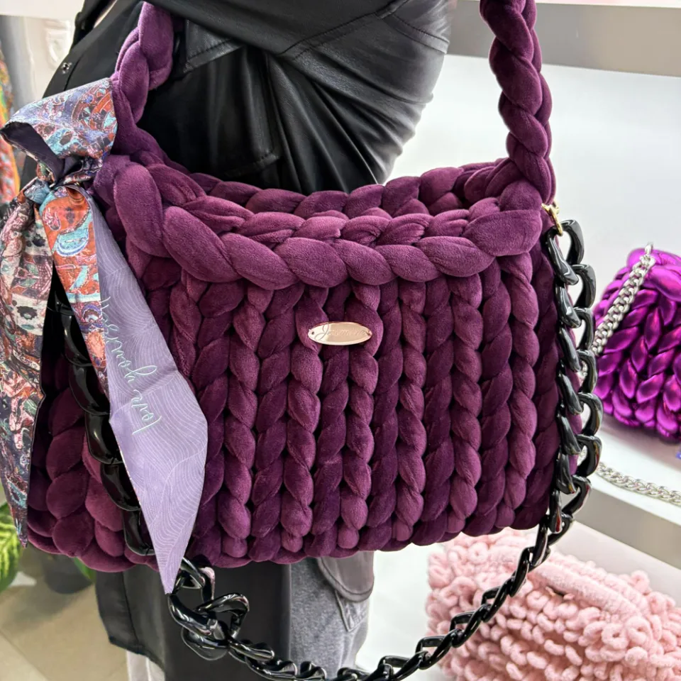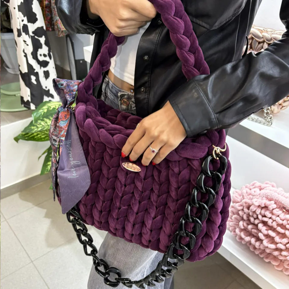 Απογειώστε το στυλ σας με την Marshmallow Bag (ή Velormellow) σε μοναδικό μωβ χρώμα. Φτιαγμένη στο χέρι από βελούδινο νήμα, συνδυάζει την πολυτέλεια της απαλής υφής με τη μοντέρνα αισθητική της σκούρας μεταλλικής αλυσίδας. Αυτή η κομψή τσάντα είναι ιδανική για καθημερινές και βραδινές εμφανίσεις, προσθέτοντας μια πινελιά διακριτικής φινέτσας.