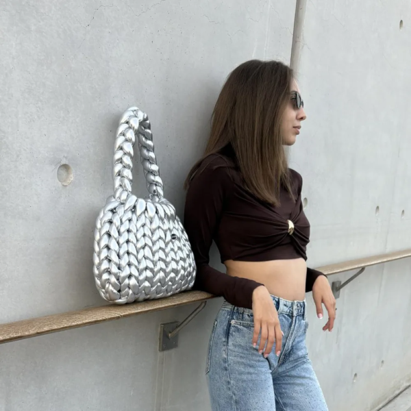 Φτιαγμένη στο χέρι από υψηλής ποιότητας μεταλλιζέ κορδόνι, διαθέτει chunky πλεκτό σχέδιο που χαρίζει όγκο και πολυδιάστατη λάμψη. Το λουρί της είναι άνετο και σταθερό, ενώ το μεταλλικό tag Jasmine αναδεικνύει τον premium χαρακτήρα της.